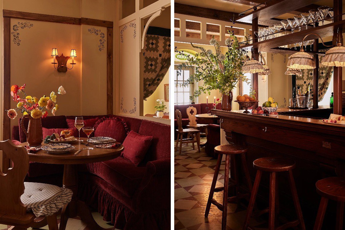 Along with design firm Greco Deco, the group has gone cuckoo for country house, creating interiors decorated to the hilt with cozy wooden furniture, pine cladding, archival wallpaper, pastoral murals, and colors that, according to the press release, “are somewhere between sweet pastels and melancholia.”